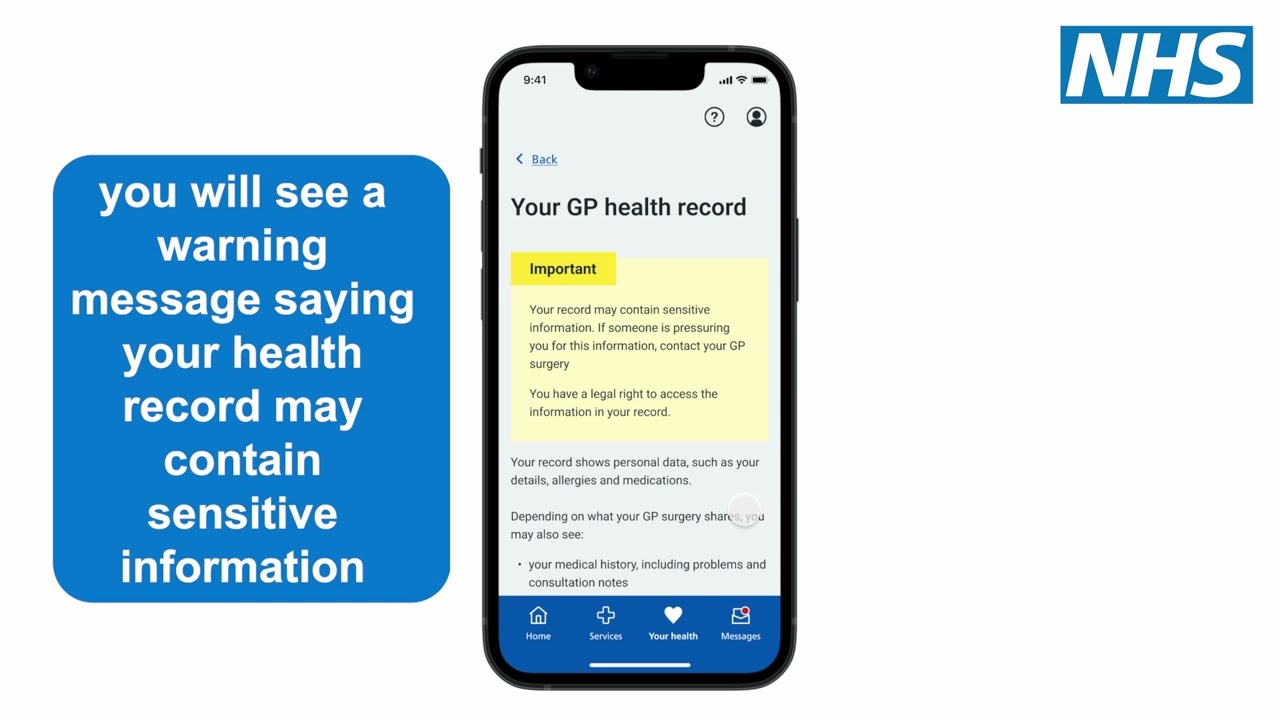 - view your GP health record to see information like your allergies and medicines (if your GP has given you access to your detailed medical record, you can also see information like test results)